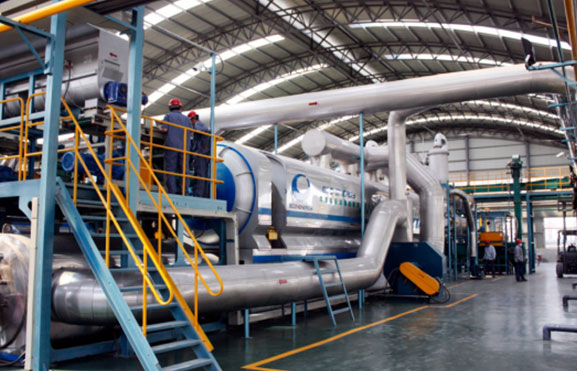After edge trimming and crushing, waste tires continuously enter the core decomposition reactor. Under the advanced intelligent control system’s regulation, they are precisely heated in a micro-pressure, oxygen-free environment. Materials are uniformly heated under large processing volume conditions, enabling product transformation at relatively low temperatures. The production line is equipped with an advanced waste heat recycling system. Generated non-condensable gases, after purification, can be used as fuel for supplementary heating. Additionally, high-temperature flue gas waste heat is simultaneously utilized, making heat utilization more comprehensive and significantly improving pyrolysis efficiency, thereby achieving energy conservation, carbon reduction, and emission reduction.